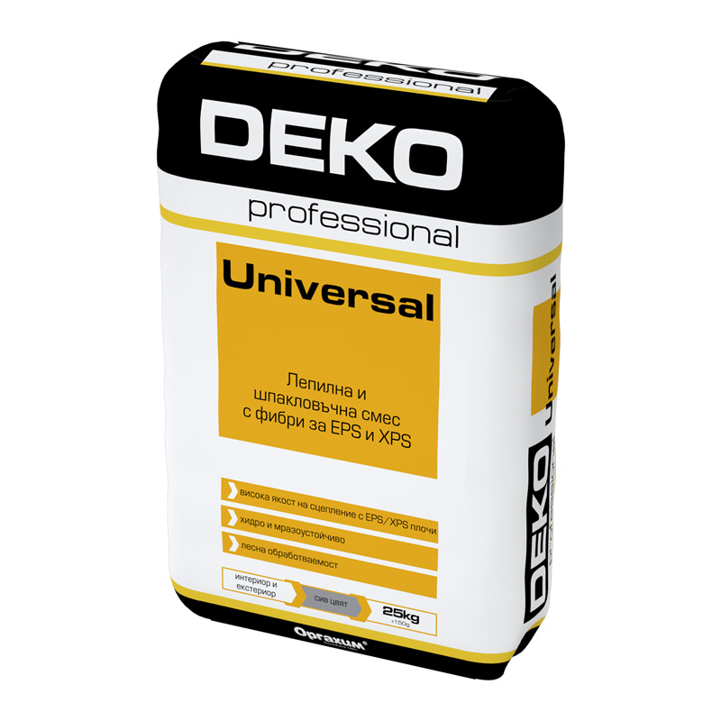 DEKO Professional Universal is an adhesive and putty mixture containing fibers for gluing and plastering of thermal insulation from EPS and XPS (expanded/extruded polystyrene, expanded polyurethane, cork, etc.). The adhesive-putty mixture can be applied on walls or ceilings directly on plaster, masonry or concrete.