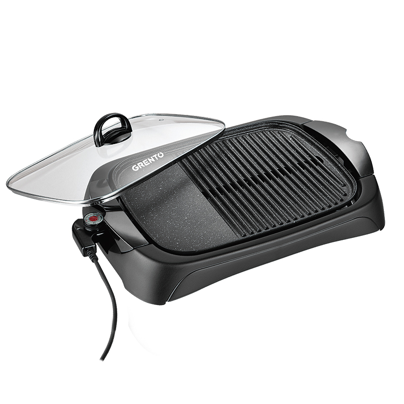 Grill plate model GL 3420, manufactured by GRENTO has a beautiful and comfortable design. It has 2000W of power and is heated by a thermostat. The plate is heated with even heat. The electric grill has a ribbed and smooth baking surface. It is easy to clean and maintain thanks to the non- stick coating, and unnecessary grease is collected in a pan. The glass lid allows stewing of products and additional options and experiments in baking. The dimensions of the grill plate are 30 x 40 cm.