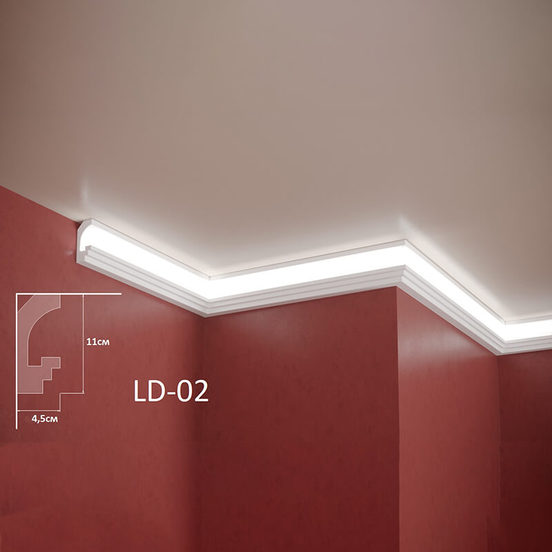 LED lighting profile, model LD-02, manufactured by ADORN. Concealed lighting profiles create an exceptional effect in the interior space. The products are made of XPS extruded polystyrene foam, which makes them extremely light and easy to install and at the same time strong enough. Its length is 2 m and the dimensions are 4.5 x 11 cm, and the model can be mounted in two different ways. In the two different options for laying the profile, the effect of LED lighting changes, as shown in the situational photos.