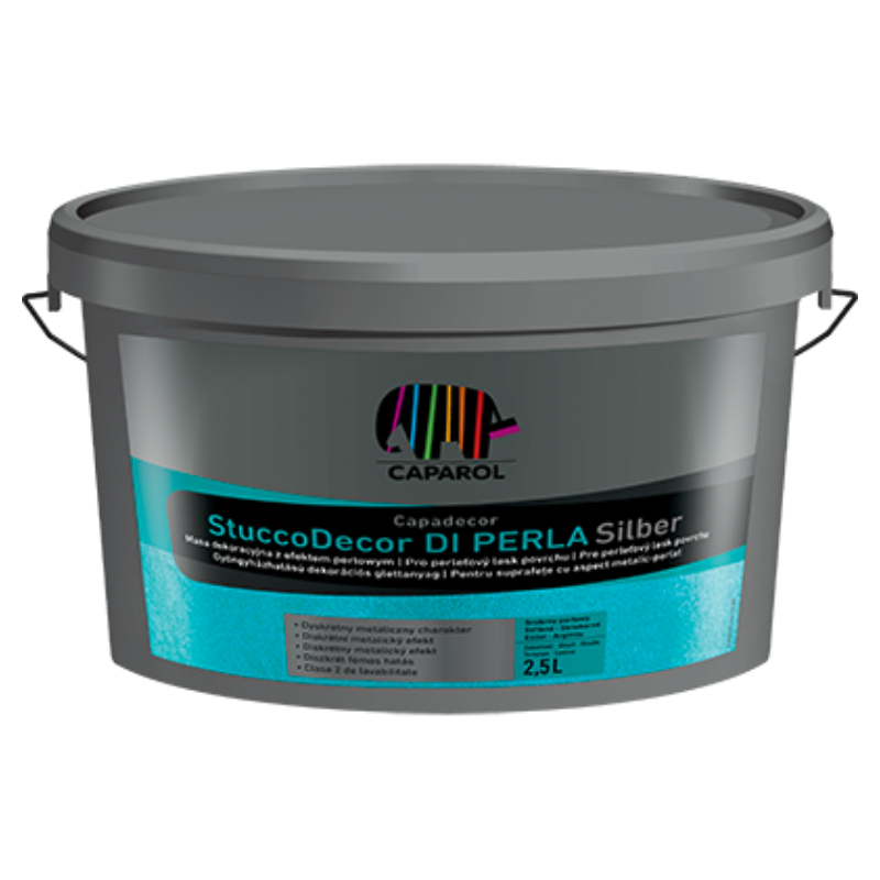 CAPAROL Stucco Decor Di Perla Silver decorative plaster - a putty with a metallic tint for individual decorative design of interior walls and ceilings. It is mainly used for high-quality interior decorative designs in hotels, restaurants, offices, medical offices, homes, etc.