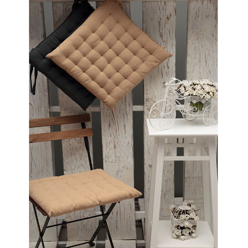 Square cushion for chair HOMETEX with dimensions 40 x 40 cm. It has a medium level of hardness, comfortable and made of 100% cotton. Cotton fibers are also used for the plowing. The color of the pillow is beige.