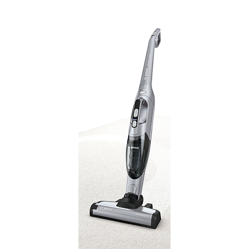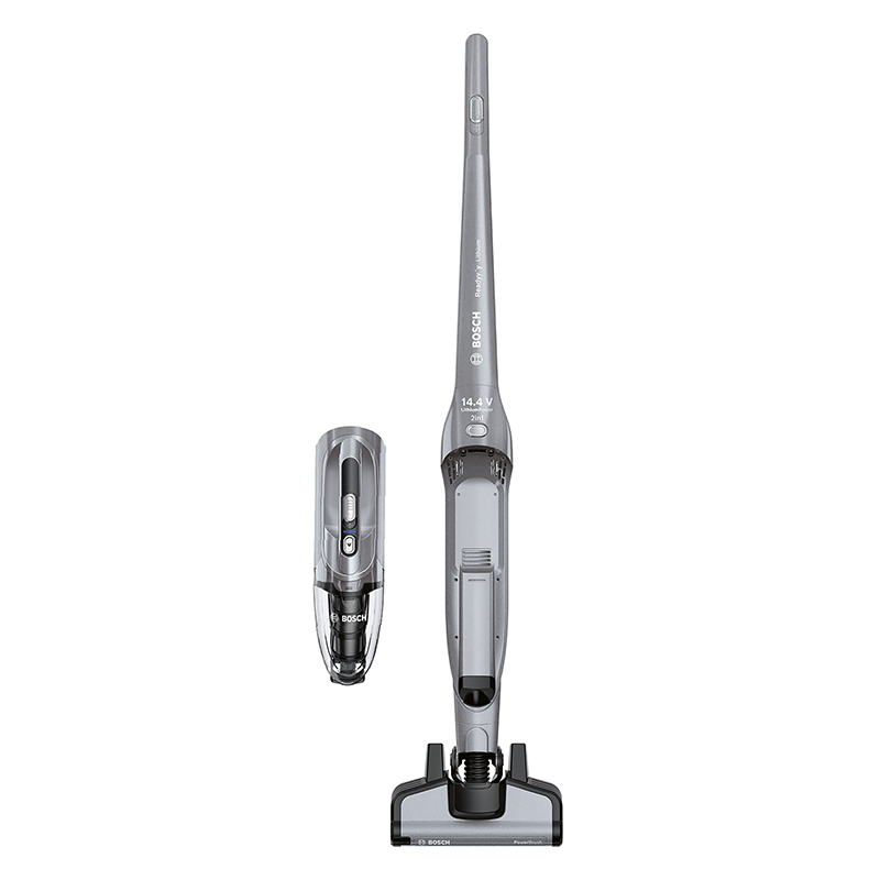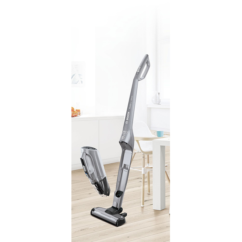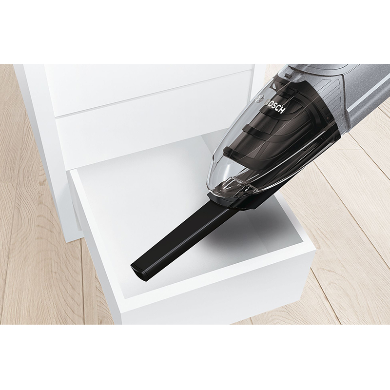 Practical cordless 2in1 vacuum cleaner model BBHL21435 manufactured by BOSCH. The cleaning device is actually 2 products - a mini handheld and a standing vacuum cleaner. Quickly cleans all floors, even under furniture, using the extremely maneuverable brush or any other surface with the built-in mini hand-held vacuum cleaner. The motorized PowerBrush and the efficient air directing system always guarantee excellent and visible results. The lithium-ion battery provides consistently high performance and short charging times.