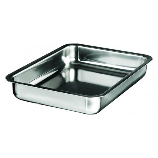 Baking tray of the CHROME SILISTRA brand. The tray is rectangular in shape with dimensions of 38.5 x 29.5 x 7 cm. It is made of stainless steel - stainless steel, 0.8 mm thick.