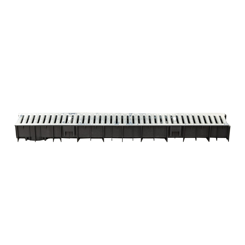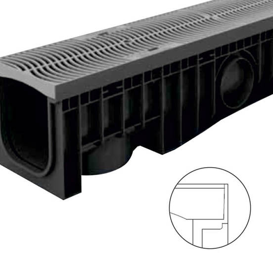 Drain gutter PP WAVE90 is made of high quality PE-HD material.The height of the gutter is 90 mm and has a flat edge and grille covering the entire surface of the channel. Low weight, high durability, easy installation and compactness are some of the qualities of PP WAVE90. It is suitable for grilles with load class A 15. The grille is made of galvanized/stainless steel, with transverse rectangular holes measuring 30 x 10 mm.