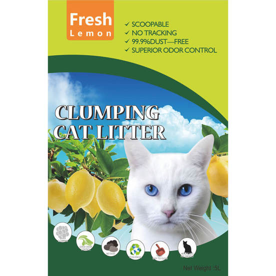 Cat toilet 5 liters of lemon. Origin: China. The product is a toilet sand for cats made of calibrated bentonite with lemon aroma.