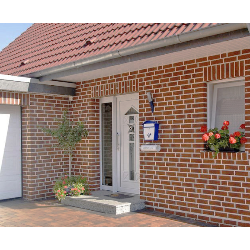 Facing stone from the Masterbrick series of the MATHIOS brand in tile red color. The elements are of different sizes and thickness 8-10 mm. Their surface is matte. One box contains elements with a roof area of 0.93 sq.m.