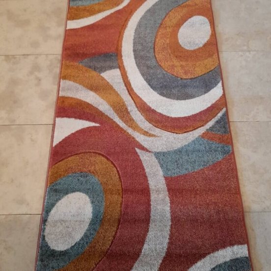 Carpet from the Tribeca series of the DECOTEX brand. The carpet measures 80 x 150 cm and has colored arches. It is made of 100% polypropylene frieze with a velor height of 9 mm and a density of 224,000 knots/sq.m. The carpets and aisles of this series are characterized by natural and soft feel, high density and wear resistance.