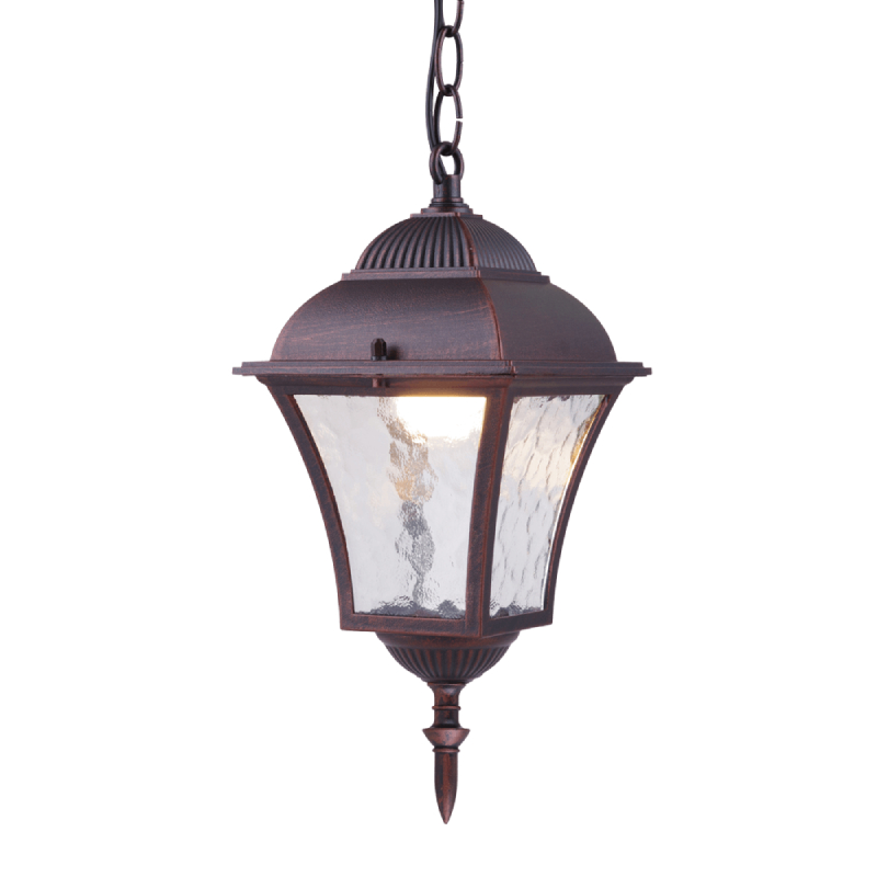 Garden lantern from the Sofia series of the VIVALUX brand. Designed for hanging from the ceiling. The lantern has an aluminum body in red patina and decorative frosted glass. Its dimensions are 14.5 x 14.5 x 100 cm, and 100 cm is the total length.
