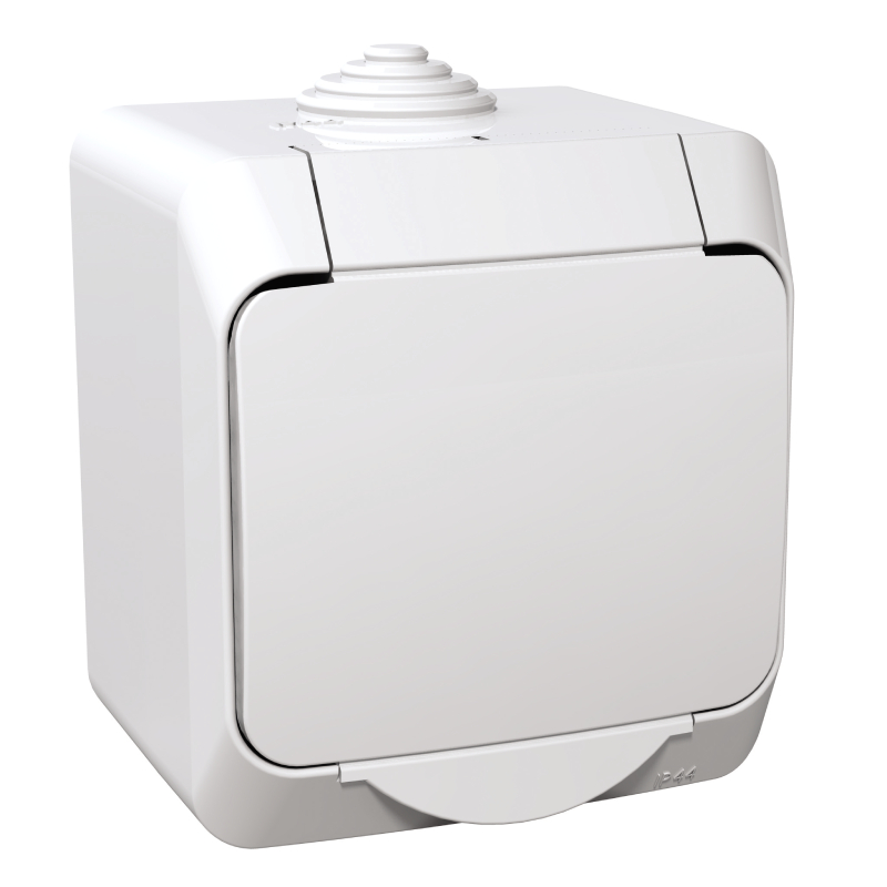 Single electrical contact with protective cover from the CEDar Plus series of the SCHNEIDER ELECTRIC brand. Made of high quality white plastic. Designed for outdoor installation. The contact has a high degree of protection IP44, which makes it waterproof and suitable for outdoor use, as well as in humid rooms.