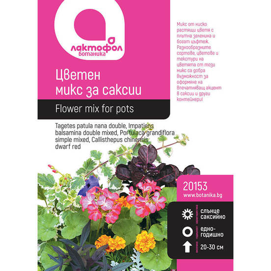 A mix of low-growing flowers with dense greenery and abundant flowering. The variety of varieties, colors and textures of flowers from this mix are a good opportunity to form an impressive accent in pots and other containers. The mix contains seeds from Tagetes, Impatiens, Cobblestone and low-growing Astra, which are easy to grow and unpretentious to maintain flowers.