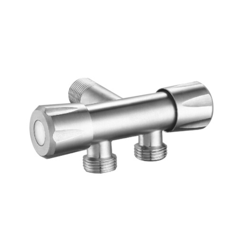 AQUAFEAST double crane. It is a corner tap with two outlets. Made of stainless steel with stainless steel coating. The faucet has ceramic heads. The connection size and the dimensions of the terminals are 1/2".