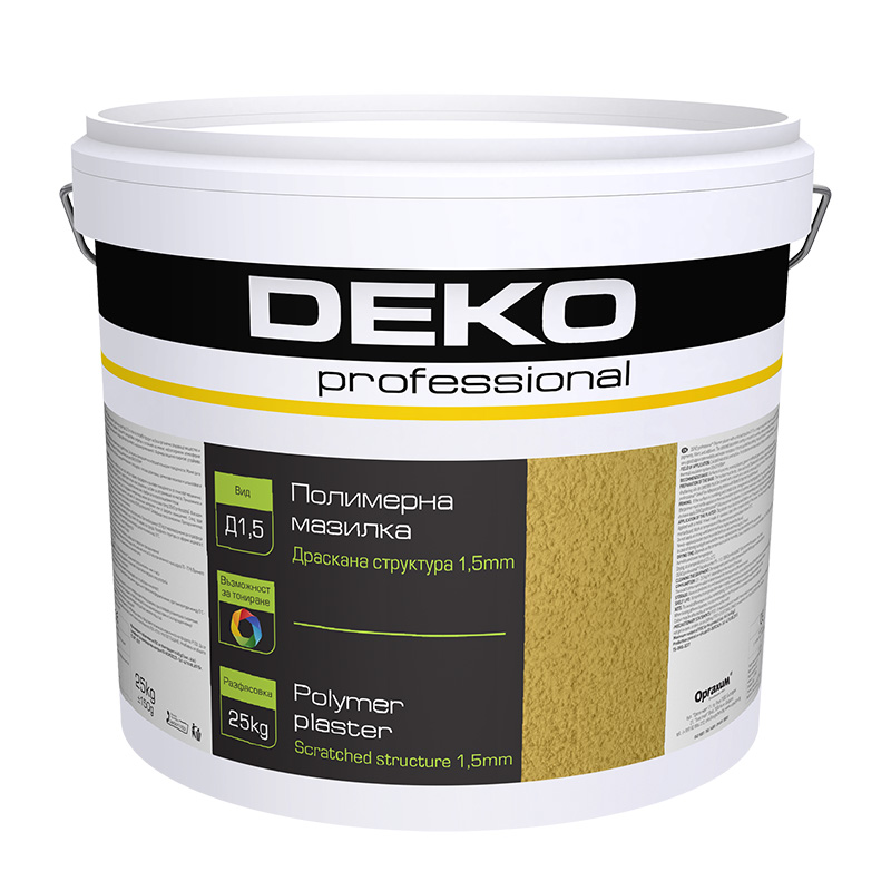 DEKO professional Polymer plaster with a scratched structure with a size of 1.5 mm is a ready-to-use paste-like plaster based on organic binder and specially selected pigments, fillers and additives. For indoor and outdoor use.