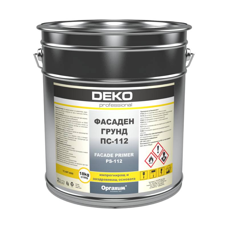 DEKO professional Facade primer PS-112 is a solution of thermoplastic acrylate resin in active solvents. For impregnation of cement, lime-cement plasters, elements of light and cellular concrete, asbestos cement, etc.