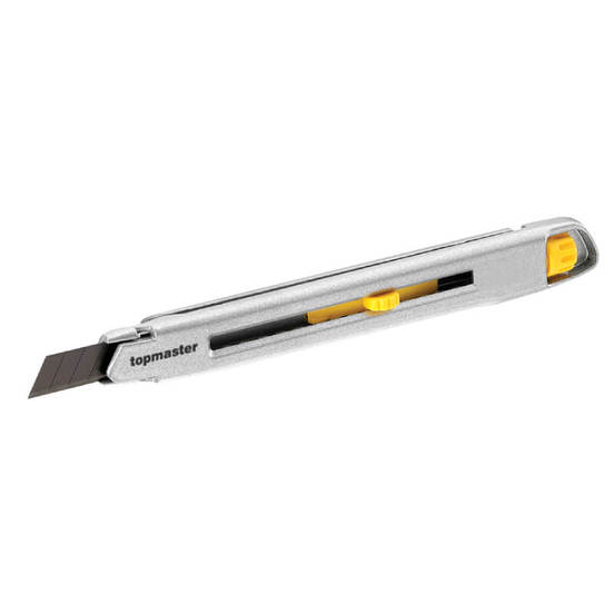 Model knife of the TOPMASTER brand. The knife measures 135 x 9 mm. It has a metal body and a breakable SK2 steel blade. It features triple sharpening of the cutter.