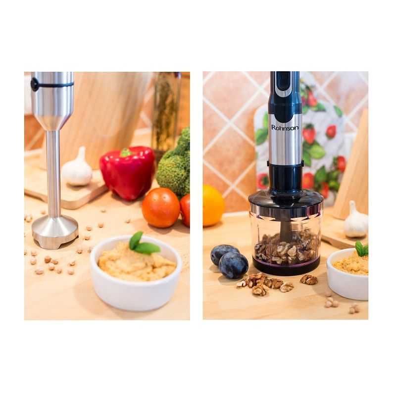 The R 581 blender of ROHNSON has a power of 900W. The kitchen appliance has a nozzle, knife and stirrers made of stainless steel. With it you can mash, puree, chop, beat eggs, cream and more. Thanks to the 2 speeds, the additional Turbo button and the convenient, ergonomic design, the model handles all ingredients with ease. It is easy to assemble and disassemble and is convenient to store. Comes complete with a chopper with a capacity of 500ml, measuring bowl 1000ml and stirrer.