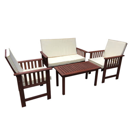 Set of garden furniture, consisting of 4 parts - one table, 2 armchairs with armrests and 1 bench with armrests. Pillow and back cushions are included in the set.