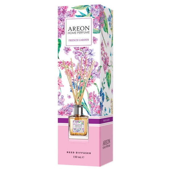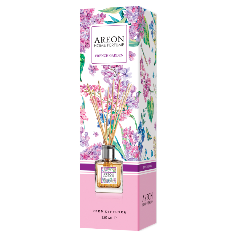 Fragrance in the form of a glass bottle and rattan sticks of the AREON brand. Charming perfume for home and office.