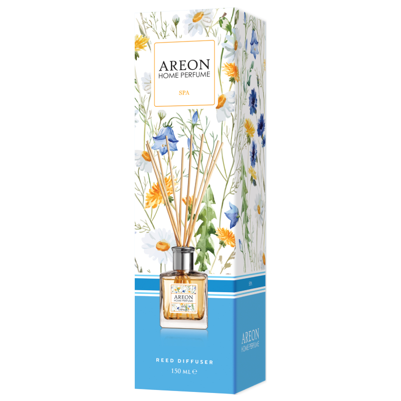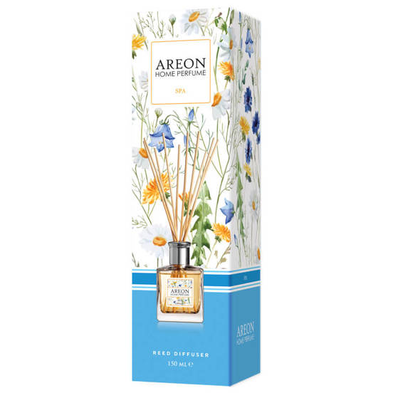 Fragrance in the form of a glass bottle and rattan sticks of the AREON brand. Charming perfume for home and office.