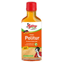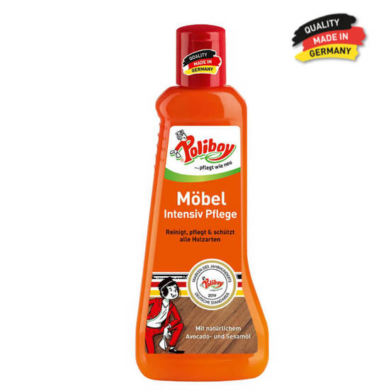 The product for wooden surfaces, model Möbel Intensiv Care, of the German brand POLIBOY has a threefold effect by cleaning, caring for and protecting furniture surfaces of all kinds. The furniture cleaner removes dust during its application, cleans hygienically and without streaks, and stains disappear quickly and easily. At the same time protects against UV rays and dehydration thanks to sesame oil and avocado oil. Regularly maintained furniture with POLIBOY detergent is resistant to stains and moisture.