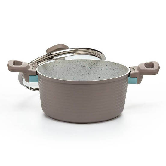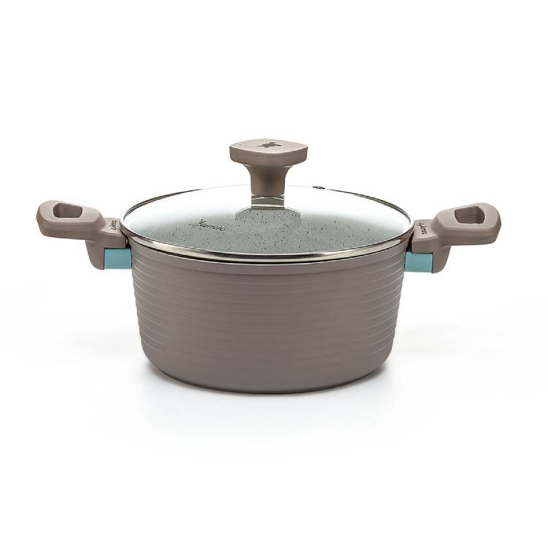 Luigi Ferrero brand saucepan. The saucepan has a capacity of 2.5 l and a diameter of 20 cm at a height of 10 cm. The bottom thickness is 4 mm. The cooking vessel is made of high-quality forged aluminum and has a ceramic coating for the best protection against sticking and burning of food. It has a glass lid with a steam vent and a stainless steel rim. It is equipped with soft heat-resistant handles for a firm grip and maximum comfort.