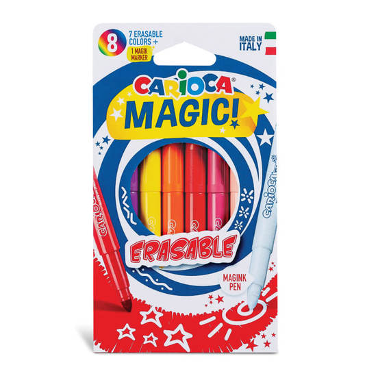 CARIOCA Magic color markers are characterized by very bright colors and excellent coverage. Magic felt-tip pens have erasable ink. For correction, go over what is drawn with a magic felt-tip pen. The width of the track is 6 mm and the tops have a block system. The box is cardboard and is a blister type. The set contains 7 + 1 pens.