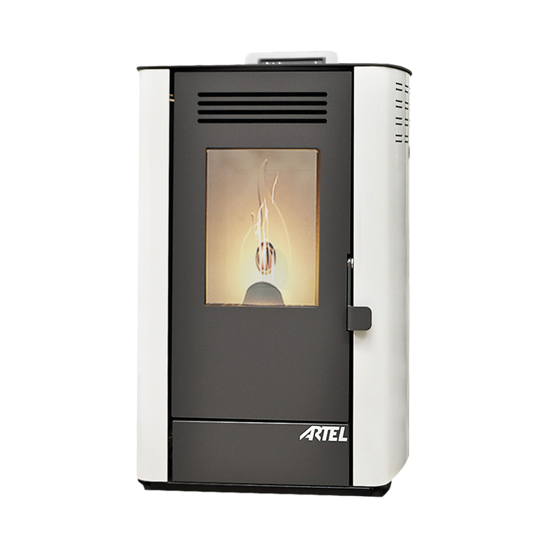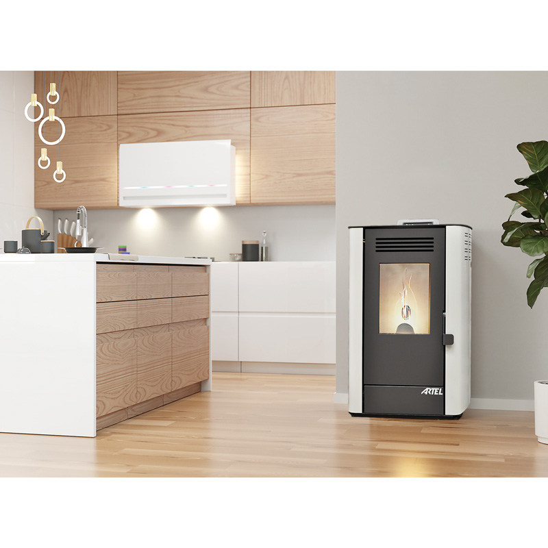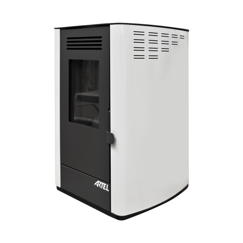 The dry fireplace has a room fan, with 5 power levels. In order to increase the resistance, the burner is made of cast iron. Ignition takes place automatically, and thanks to the built-in room thermostat, the pellet stove constantly controls the desired temperature in the room and automatically doses the supply of pellets from the hopper, which is placed in the structure of the stove. The Italian dry pellet fireplace ARTEL has an automatic air cleaning of the combustion chamber from the ash residue and has a spacious drawer that can be easily removed for cleaning. It is equipped with a flue gas fan as standard. In order to make it easier for customers, remote control and the possibility of choosing a period of operation by means of a built-in clock with a weekly programmer are also included.