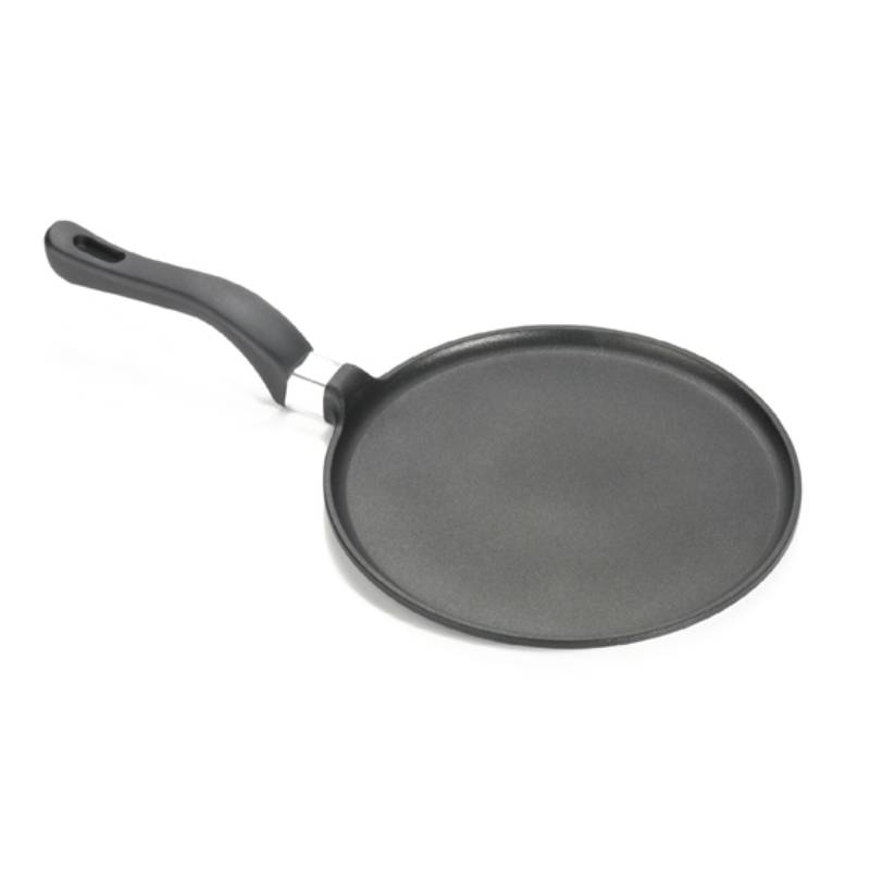 Aluminum pan for pancakes. The pan has a size of F24 cm and non-stick coating. The handle is made of bakelite and has an ergonomic shape for a stable grip. The pan ensures fast and even heat distribution. Dishwasher safe.
