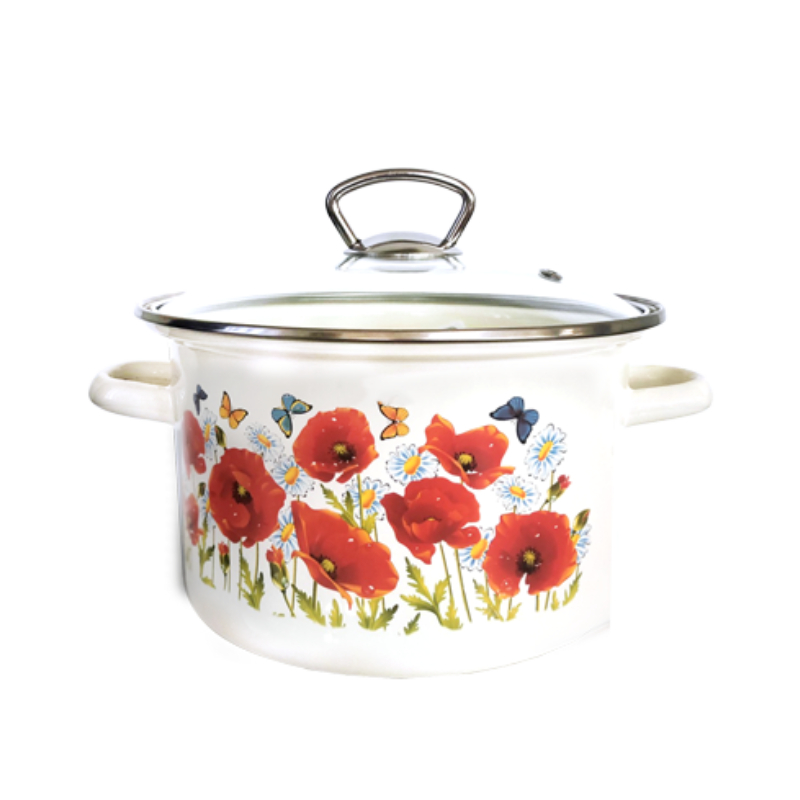 Enameled pot with glass lid. The pot is in poppies. It has a capacity of 5.5 liters. With stainless steel handles.