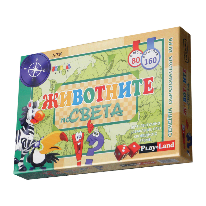 The board game "Animals of the World" by PLAYLAND is a game for adults and children over 8 years. Two to four players can participate, with the game being led by a host. To play you need not only luck but also knowledge. The goal of each player is to go through as many red and blue moves with numbers as possible to answer more questions and get more money and tokens. The player left without money leaves the game. The winner is the player who first filled in the Questions in his sector with tokens.