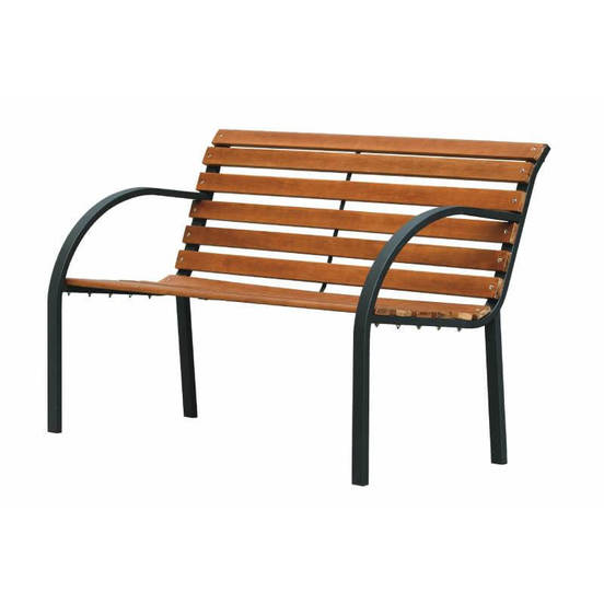 Garden bench with backrest and armrests, made of metal and wood. It is suitable for outdoor use in parks, gardens and other public spaces. The wood on the bench is specially impregnated for the highest protection against moisture, UV rays and rot.