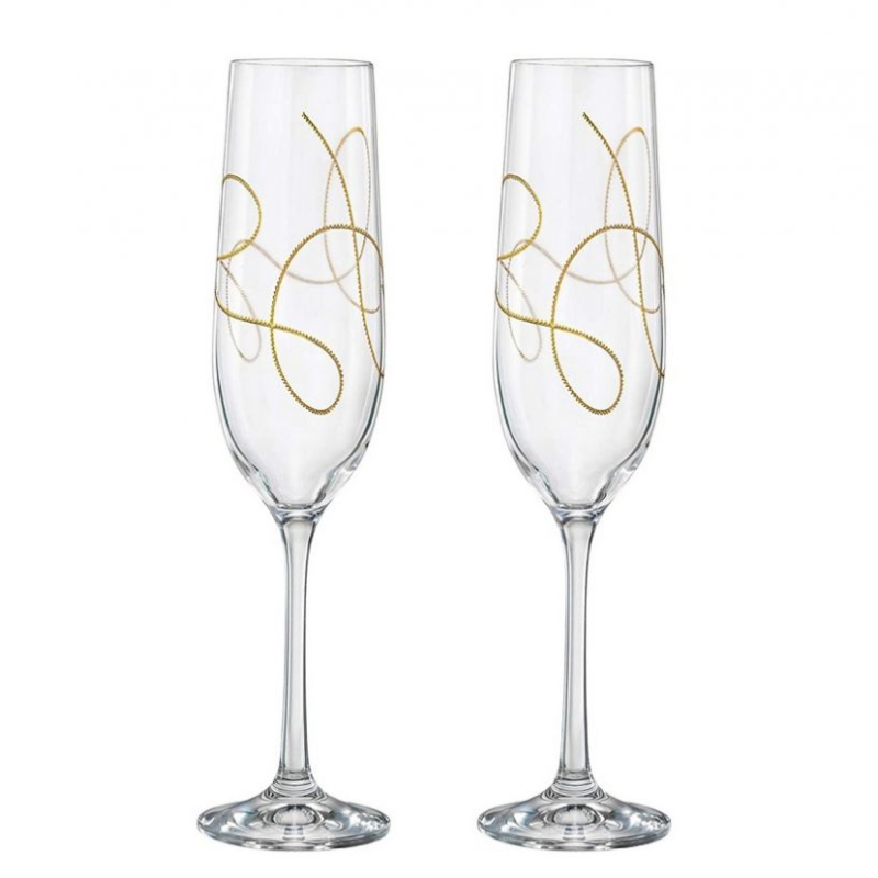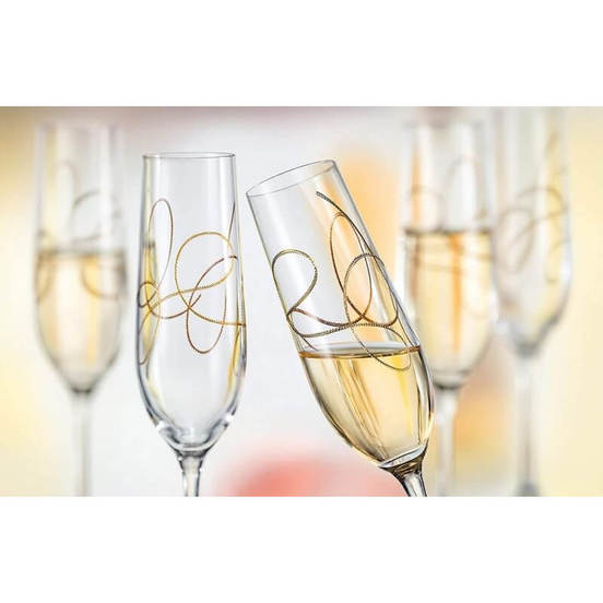 The BOHEMIA String Gold glass set includes 2 champagne glasses with a capacity of 190 ml. They are made of BOHEMIA Cristallin crystal and lead-free and cadmium-free potassium glass. The String Gold series is distinguished by smooth walls, transparent color, delicate floral engraving and hand-decorated platinum rim.