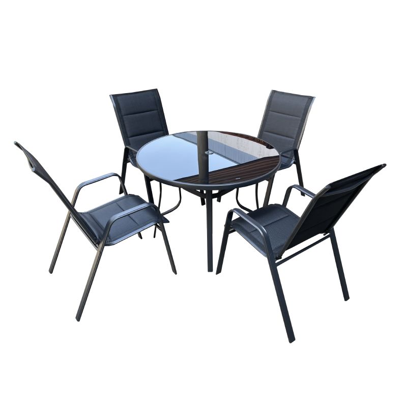 Set of garden furniture in 5 parts - 4 chairs and 1 table. Garden furniture is made with a metal tubular structure in black. The table has 5 mm tempered glass and an opening for a garden umbrella. The glass is surrounded by a metal ring measuring 35.5 x 15 mm. The seats and backs of the chairs are made of textile (high quality material with PVC coating for maximum stability and strength).