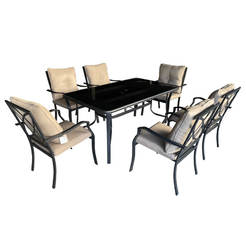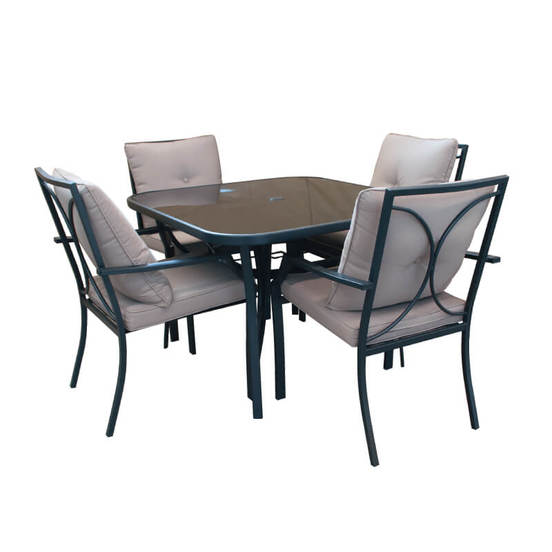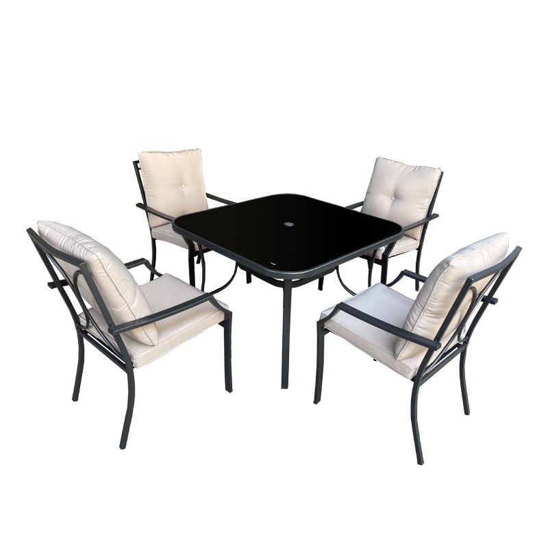 Set of garden furniture in 5 parts - 4 chairs with pillows and 1 table. Garden furniture is made with a metal tubular structure in black. The table has 5 mm tempered glass and an opening for a garden umbrella. The cushions on the seats of the chairs are 6 cm thick and filled with a density of 180 g (polyester). The covers do not come off. They are made of textile (high quality material with PVC coating for maximum durability and strength).