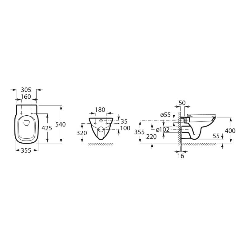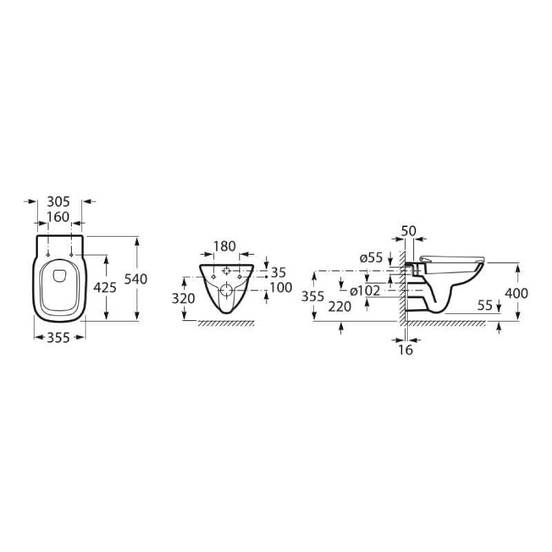 The hanging toilet bowl measures 355 x 540 x 400 mm.