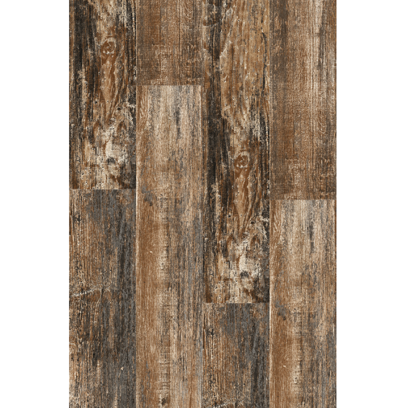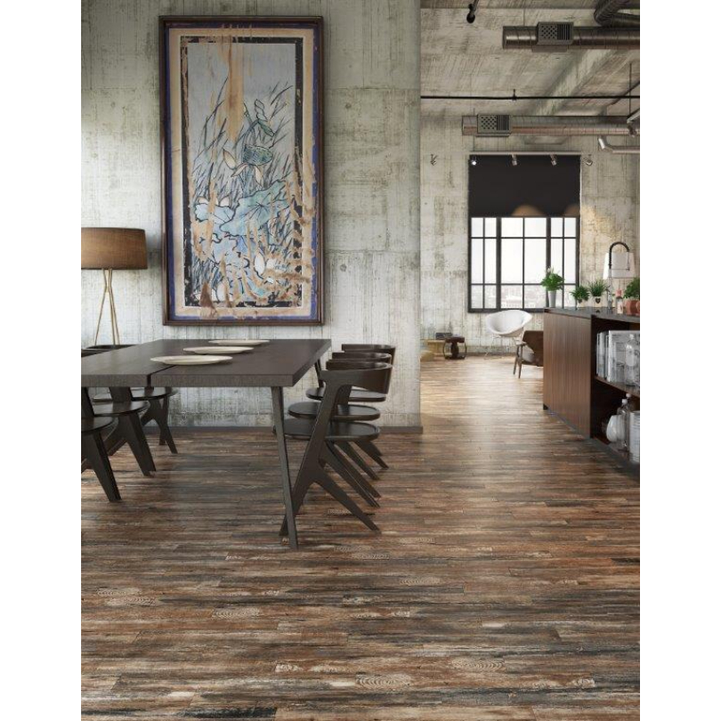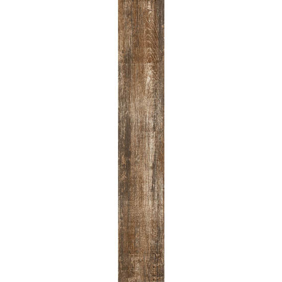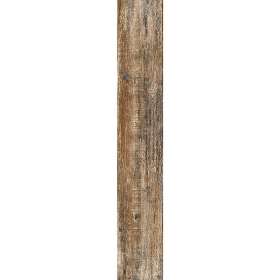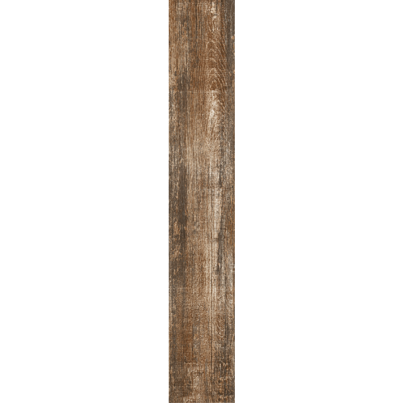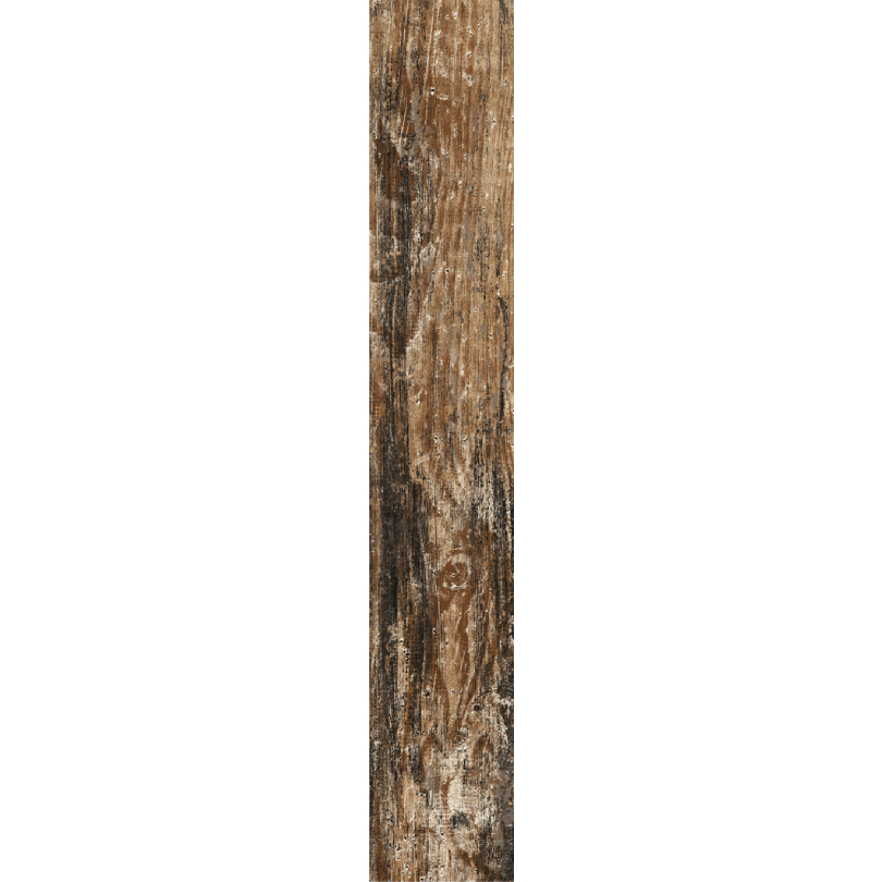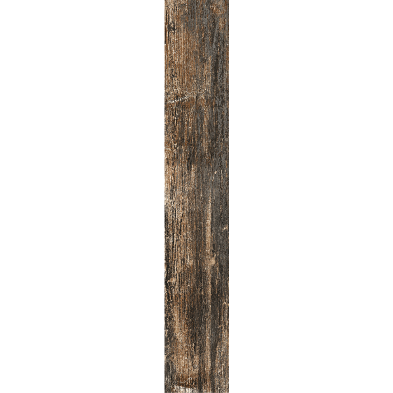 Granite tiles from the Burn Wood series, model Brown, of the SERAMIKSAN brand in brown color. The tiles are 15 x 90 cm in size and 9 mm thick. Their surface is matte and has a slight relief. One box contains 9 tiles with a roof area of 1.22 sq.m.