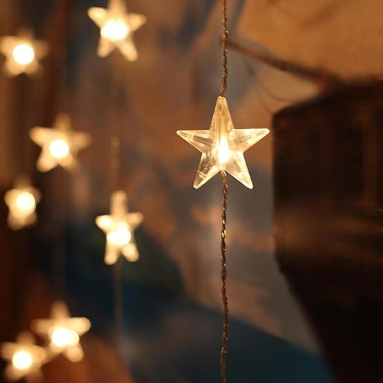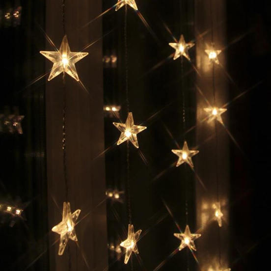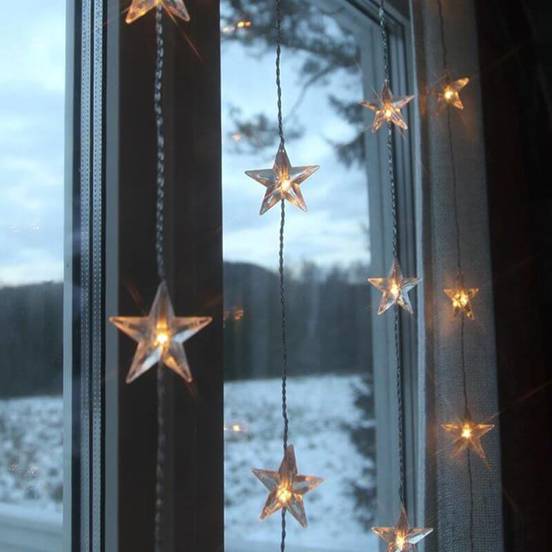Luminous curtain with 20 LED stars for home decoration. It is designed for hanging windows, curtains or drapes. It has a 3-meter power cord that ends with an adapter for connection to the mains.