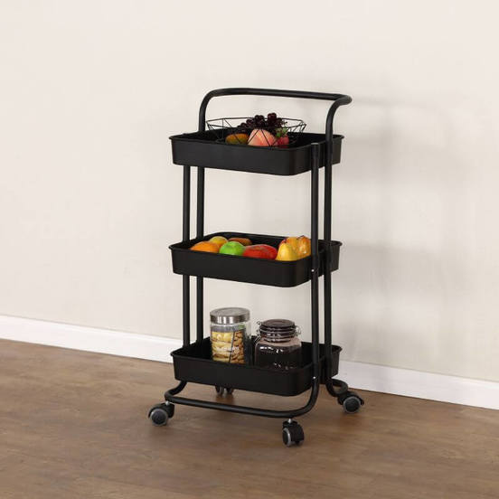 Shelf on wheels, made of metal with a powder coated surface in a stylish black color. The shelf measures 86 x 42 x 36 cm. Thanks to its wheels, the shelf can always be easily moved to where it is most needed.