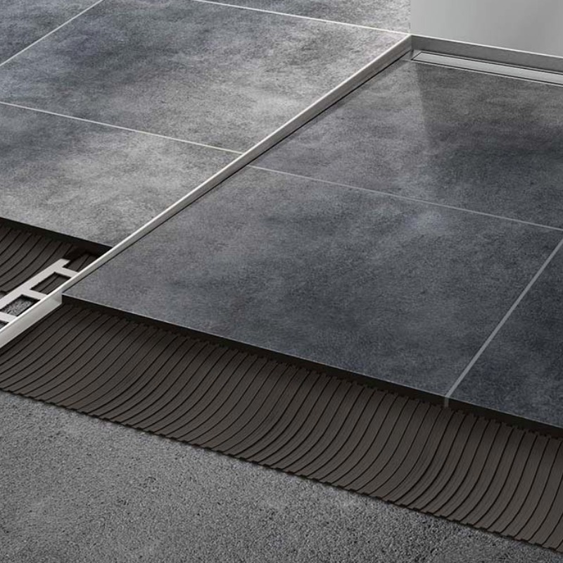 Usually the floor of the bathroom is completely covered with tiles, flat and without slope, while in the shower area, the tiles have a one-sided slope of 1.5-2% to the shower channel. This difference in slope creates a change in height, which increases near the channel of the shower area. This elegant beveled profile made of high-quality stainless steel helps to cover the transition area between the two levels.