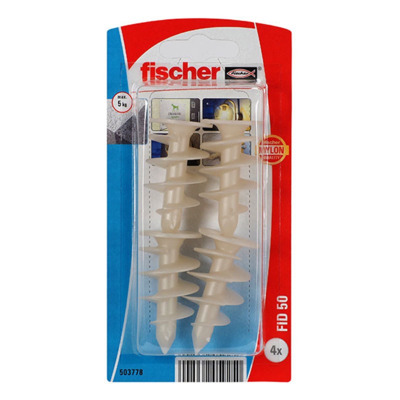 Fischer FID dowel set for fixing light parts in plastered and unplastered pressure-resistant polystyrene and polyurethane insulation boards. Fischer FID 50 is used for thin insulation panels up to 50 mm thick. Withstands higher loads.
