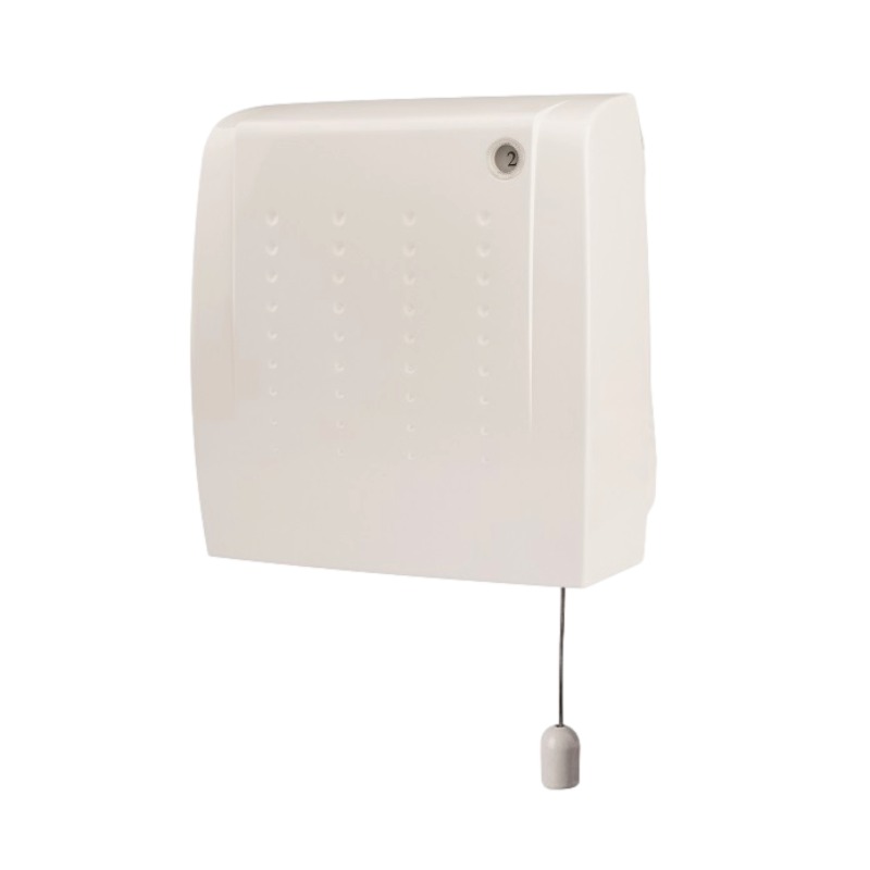 Fan heater for bathroom HBH-2004B of the brand HOMA in white color. Designed for wall mounting. It is switched on and off by pulling a cord at the bottom end.