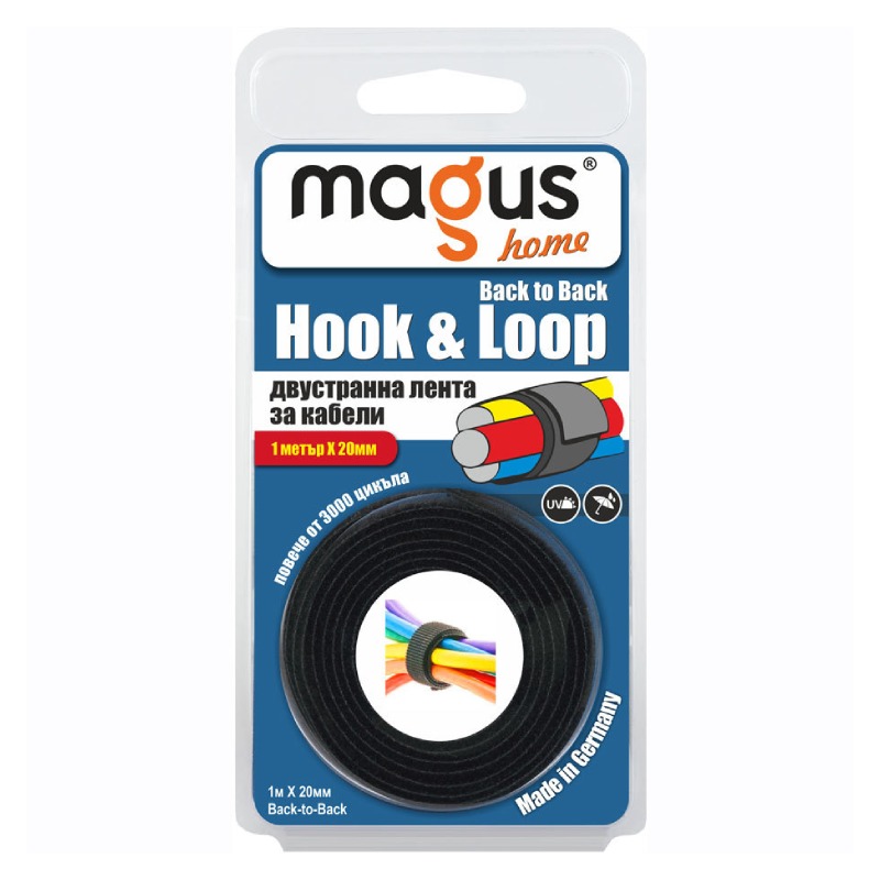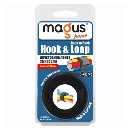 Two-sided velcro tape for cables Back to back of the brand MAGUS in black color. The tape measures 20 mm x 1 m. It is a specialized product with universal use. It has hooks on the face and loops on the back. Thus, the tape sticks to itself according to the so-called Back to back system.