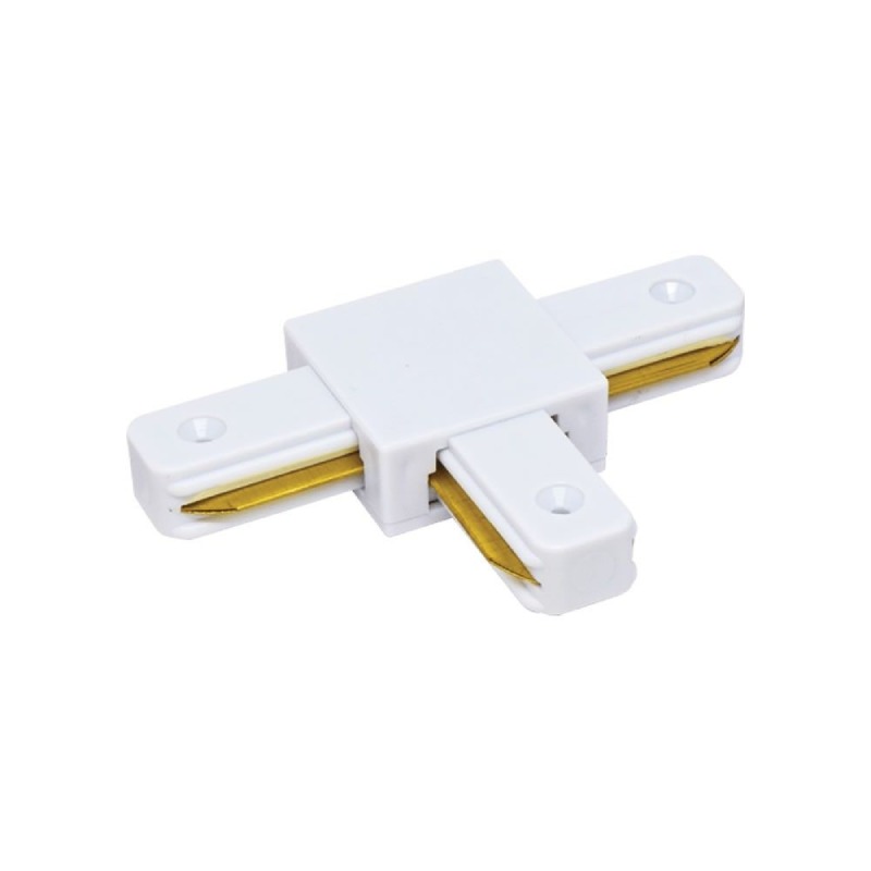 T-shaped light rail connector in white. The lighting track connector is compatible with all other VIVALUX track lighting system accessories, as well as with 1 and 2 meter long lighting tracks.
