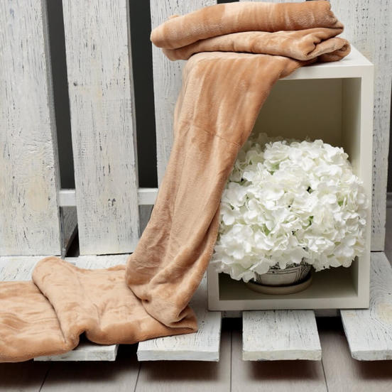 Soft and fluffy fleece blanket. The blanket measures 150 x 200 cm and is in cappuccino color. It is made of 100% microfiber - a synthetic material made especially for bed linen and duvets. An advantage of microfiber is that it dries quickly after washing and does not need to be ironed. It is characterized by exceptional strength and resistance.