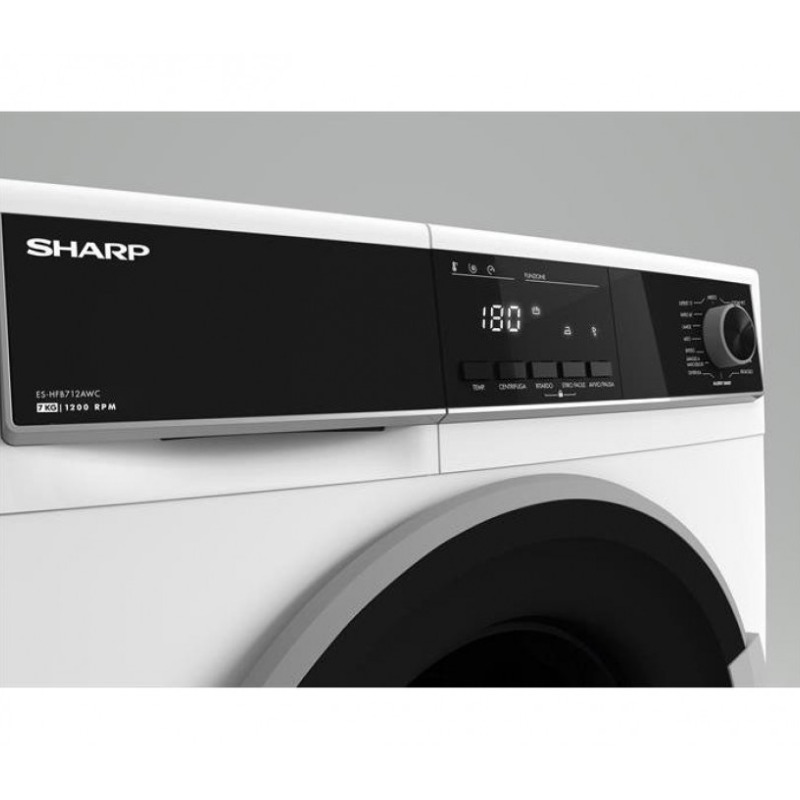 SHARP ES-HFB712AWC washing machine with front loading and washing capacity 7 kg. The washing machine is constructed with an inverter motor that keeps noise levels low even during the spin cycle.