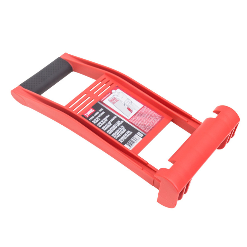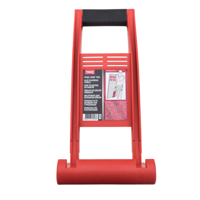 Auxiliary handle for comfortable carrying of large sheets of plasterboard, OSB boards, paneling and others. Its angled handles keep hands away from the panel for maximum comfort. The handle is made of highly resistant plastic with a load capacity of up to 80 kg.