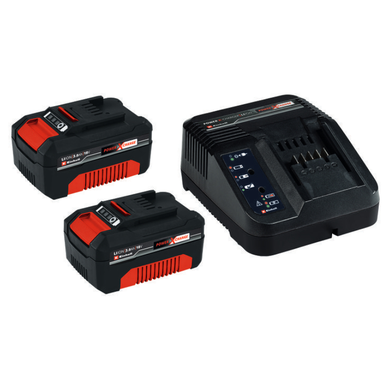 Charger and 2 Einhell batteries have a voltage of 18 V and a battery capacity of 3.0 Ah. With 6-level charge level indicator. Can be mounted on a wall. With intelligent control system for long life. Charging time: battery charges up to 85%.