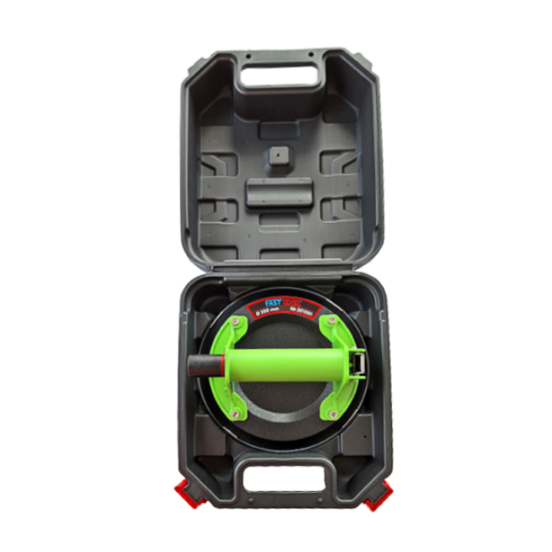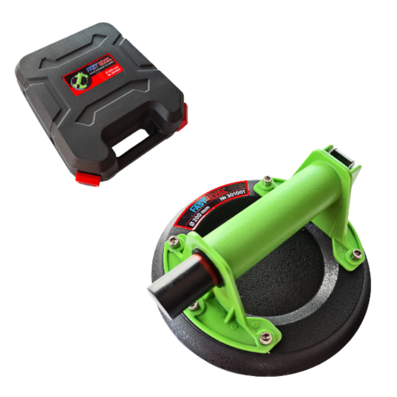 Fast Level plate suction cup with pump and metal handle has a diameter of 200 mm and a load capacity of 50 kg vertically and 110 kg. Horizontally. It has a pressure drop indicator. It is suitable for lifting, moving and holding awkward objects such as glass and ceramics. It has a sturdy handle, release button, vacuum pump and valve.