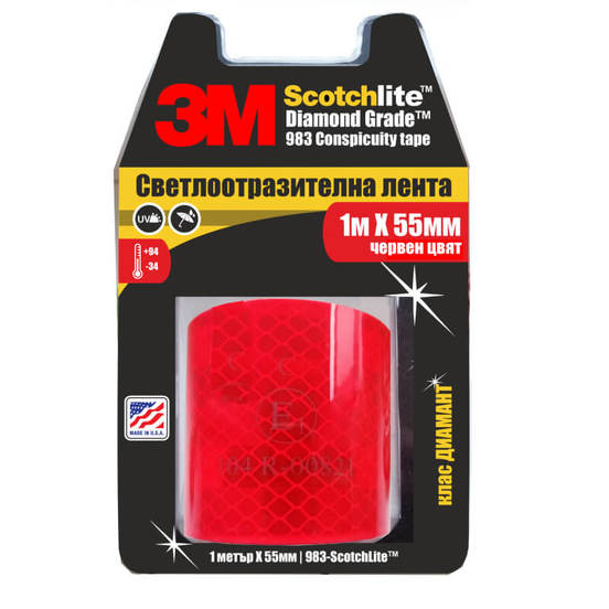 Reflective tape from the 983 series of the 3M brand in red color. High quality tape (DIAMOND grade)to be placed on trucks, trailers, caravans, trains, buses, ambulances, fire engines and other vehicles.
