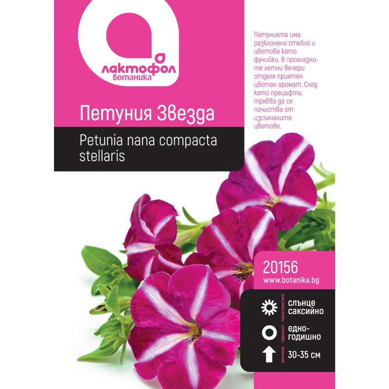 Petunia star flower seeds from the Botanic series of the LAKTOFOL brand. Petunia is a potted annual plant. It has a branching stem and cone-like flowers. On cool summer evenings it gives off a pleasant floral scent. After blooming, the petunia should be cleaned of the withered flowers. It grows well in sunny places and requires regular watering. It propagates in March-April by seeds. With its variety of colors, shapes, colors, abundant and long flowering, it is among the most popular garden plants.