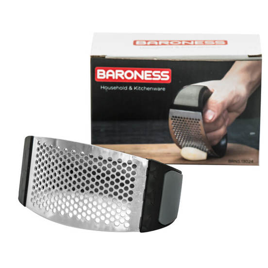 Garlic press of the Turkish brand BAST PLASTIC. The press has a stainless steel working part and a black plastic handle. Dimensions: 10.7 x 5.2 cm.